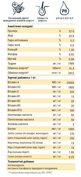 | Аналитические компоненты | Протеин 32%, жир 20%, сырая клетчатка 5.3%, сырая зола 6.8%, кальций 1.3%, фосфор 0.95%, магний 0.08, таурин 1500 мг/кг |