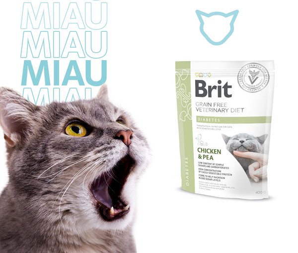 Brit Grain Free Veterinary Diet Diabetes - полноценный диетический беззерновой корм, который применяется для коррекции уровня сахара в крови при диабете и гипергликемии у взрослых кошек. Помогает поддерживать оптимальный вес.