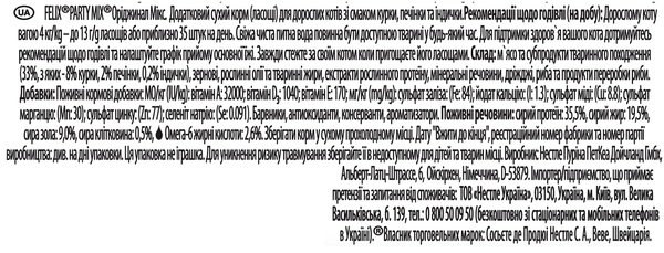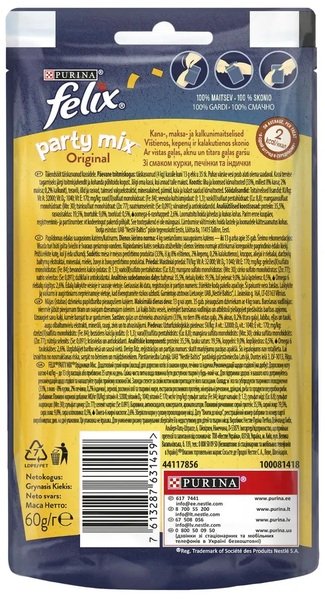 - Сухой корм для котов Felix Party Mix Original Mix микс со вкусом курицы, печени и индейки 60 г