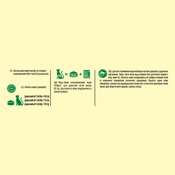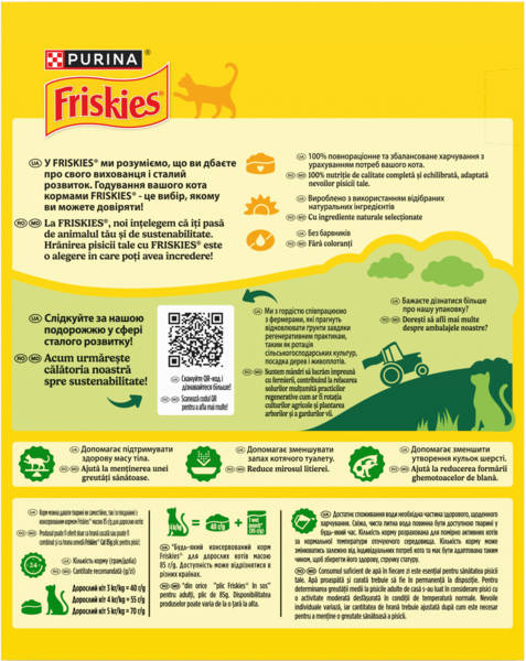 Наши кошки - природные исследователи, заинтересованные во всем, что происходит вокруг них. Коты, которые постоянно находятся в помещении, лишены радости и преимуществ общения с природой. Именно поэтому эксперты Purina разработали корм Friskies, для удовлетворения пищевых потребностей кошек, живущих дома. Без добавления искусственных ароматизаторов и красителей. Friskies обеспечивает кошек качественным, сбалансированным питанием на протяжении десятилетий. Мы наполняем миллионы мисочек для кошек и гордимся этим, неся огромную ответственность. От нас зависит обеспечение уверенности в том, что все кошки, которые питаются вкусными кормами Friskies, получают здоровое питание, в котором они нуждаются. Именно поэтому корма Friskies не содержат добавленных искусственных ароматизаторов и красителей. Поэтому вы можете продолжать кормить их тем вкусным кормом, который они любят, и гордиться этим.