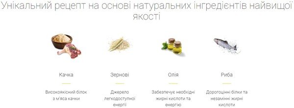 Зерновые; мясо и продукты животного происхождения (мука из мяса утки 4%); продукты растительного происхождения; рыба и продукты рыбного происхождения (4%); масла и жиры; минеральные вещества.