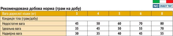 Рекомендуемую ежедневную порцию корма можно разделить на 2 приема. Индивидуальные потребности в питании могут отличаться в зависимости от размера, возраста и уровня активности животного. Данные предписания носят исключительно рекомендательный характер. Для достижения оптимального состояния животного может потребоваться изменение рациона. Переход на новый вид корма должен происходить в течение недели. Свежая чистая вода должна постоянно быть доступна вашему питомцу. Хранить в сухом и прохладном месте.