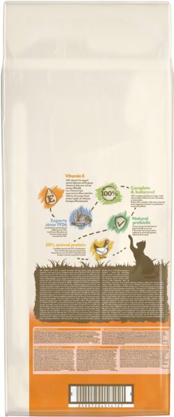 | Состав | Зерновые (цельнозерновые 48%), мясо и субпродукты животного происхождения (25%, из которых 14% курицы), экстракты растительного протеина, животные жиры, продукты переработки овощей, овощи (2% сушеного корня цикория, 0.07% сушеной моркови, что эквивалентно 0.4% моркови, 0.07% сушеного гороха, что эквивалентно 0.4% гороха), минеральные вещества, дрожжи (0.3%) |