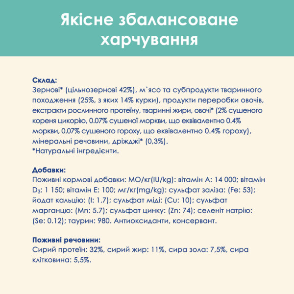 | Состав | Зерновые (цельнозерновые 42%), мясо и субпродукты животного происхождения (25%, из которых 14% курицы), продукты переработки овощей, экстракты растительного протеина, животные жиры, овощи (2% сушеного корня цикория, 0,07% сушеной моркови, что эквивалентно 0,4% моркови, 0,07% сушеного гороха, что эквивалентно 0,4% гороха), минеральные вещества, дрожжи (0,3%) |