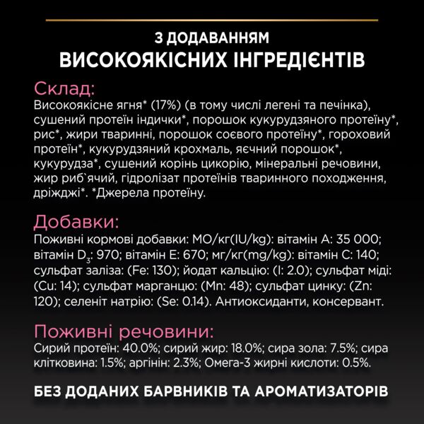 Сухой полно рационный корм специально разработан для взрослых кошек с чувствительной системой пищеварения. Содержит высококачественные отобранные источниками белка без добавления пшеницы, для поддержания пищевой переносимости. С содержанием аргинина, антиоксидантов и омега-3 жирных кислот для поддержания здоровья почек. Ягненок - ингредиент номер 1. Вкусный рецепт, который может удовлетворить даже требовательного кота. Без добавленных красителей и ароматизаторов. В Purina Pro plan наша команда диетологов и опытных ветеринаров применяет передовые достижения науки для разработки нашего сбалансированного и эффективного сочетания питательных веществ для вашего питомца. Наши рационы обладают рядом свойств, таких как высокая усвояемость и высокое поглощение питательных веществ, чтобы поддержать естественную защиту вашего любимца и его долгосрочное здоровье. Такие ингредиенты как курица, ягненок, лосось, индейка, утка, треска и говяжьи субпродукты предварительно заморожены для сохранения ключевых питательных веществ и приготовлены для отличного вкуса. Международное общество врачей-фелинологов признает благоприятный вклад кормов Purina в благополучие кошек.