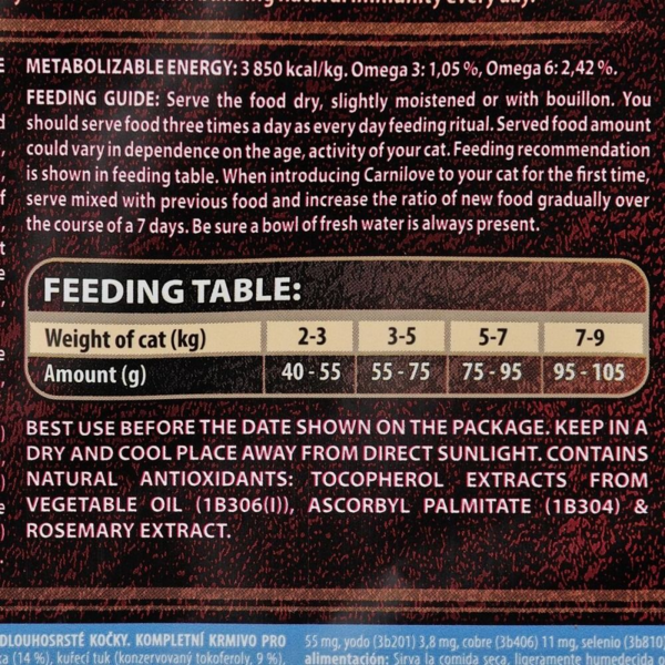| Пищевые добавки | Витамин A (3a672a) 23 000 МЕ, витамин D3 (3a671) 940 МЕ, витамин E (3a700) 650 мг, витамин C (3a312) 300 мг, таурин (3a370) 2 400 мг, холина хлорид (3a890) 2 200 мг, L-карнитин (3a910) 65 мг, ниацинамид (3a315) 45 мг, биотин (3a880) 1,8 мг, цинк (3b606) 150 мг, железо (3b106) 48 мг, марганец (E5) 55 мг, йод (3b201) 3,8 мг, медь (3b406) 11 мг, селен (3b810) 0,23 мг, L-метионин (3c305) 14 мг, аргинин ( 3c3.6.1) 12 мг, L-лизин (3.2.3.) 10 мг |