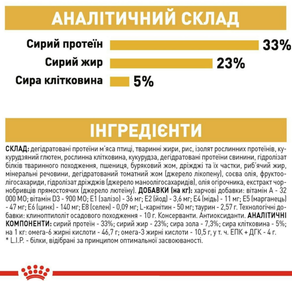 | Аналитические компоненты | Сырой протеин - 33%; сырой жир - 23%; сырая зола - 7,3%; сырая клетчатка - 5%; на 1 кг: омега-6 жирные кислоты - 46,7 г, омега-3 жирные кислоты - 10,5 г, в т. ч. ЭПК/ДГК - 4 г |