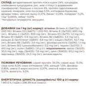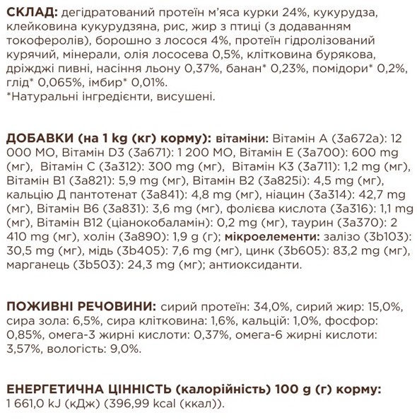 | Состав | Дегидратированный протеин мяса курицы 24%, кукуруза, клейковина кукурузная, рис, жир из птицы (с добавлением токоферолов), мука из лосося 4%, протеин гидролизованный куриный, минералы, масло лососевое 0,5%, клетчатка свекольная, дрожжи пивные, семена льна 0,37%, банан 0,23%, помидоры 0,2%, боярышник 0,065%, имбирь 0,01% |