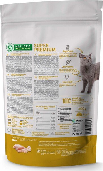 Nature's Protection Senior (10 Years And Older) - это полноценный корм для кошек от 10 лет и старше для поддержания веса и здоровья пожилых котов. Тщательно отобранные ингредиенты и источники натуральной клетчатки смягчают последствия замедленного пищеварения и поддерживают естественные защитные системы организма. Корм содержит меньше калорий, дополнен L-карнитином. Идеально подходит для предотвращения набора лишнего веса и ожирения из-за ограниченной подвижности. Высококачественный мясной протеин, подаваемый в нужном количестве, помогает поддерживать мышечную силу стареющей кошки.