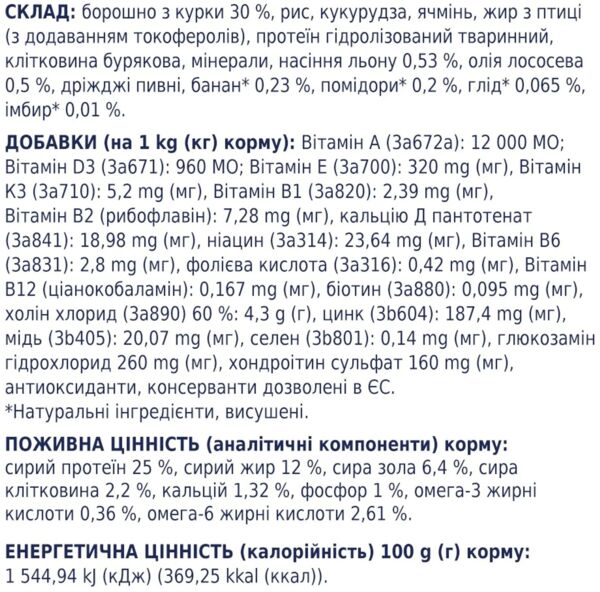 | Пищевые добавки | Витамин а (3а672а): 12 000 мо; витамин d3 (3а671): 960 Мо; витамин е (3а700): 320 mg (мг), витамин к3 (3а710): 5,2 mg (мг), витамин В1 (3а820): 2,39 mg (мг), витаминВ2 (рибофлавин): 7,28 mg (мг), кальция Д пантотенат (3а841): 18,98 Mg (мг), ниацин (3а314): 23,64 mg (мг), витамин В6 (3а831): 2,8 mg (мг), фолиевая кислота (3а316): 0,42 mg (мг), витамин В12 (цианокобаламин): 0,167 mg (мг), биотин (3а880): 0,095 Mg (мг), холин хлорид (3а890) 60 %: 4,3 g, Цинк (3b604): 187,4 mg (мг), медь (3b405): 20,07 mg (мг), селен (3b801): 0,14 mg (мг), глюкозамин гидрохлорид 260 mg (мг), хондроитин сульфат 160 mg (мг), антиоксиданты, консервант разрешены в ЕС. *натуральные ингредиенты, высушенные |