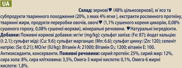 | Состав | Зерновые (48% цельнозерновые), мясо и субпродукты животного происхождения (20%, из которых 4% ягненка), экстракты растительного протеина, животные жиры, продукты переработки овощей, овощи (1.1% сушеного корня цикория, 0.08% сушеного гороха, 0.08% сушеной моркови), минеральные вещества |