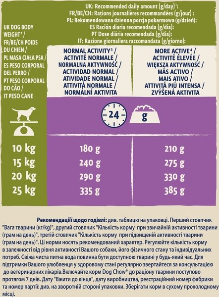 Рекомендации по кормлению: см. таблицы на упаковке. Первый столбец "Вес животного (кг/kg)", второй столбец "Количество корма при обычной активности животного (грамм в день)", третий столбец "Количество корма при повышенной активности животного (грамм в день)". Эти нормы носят рекомендуемый характер. Регулируйте количество корма в зависимости от уровня активности Вашей собаки, ее физического состояния и индивидуальных потребностей. Свежая чистая питьевая вода должна быть доступна животному в любое время. Для поддержания Вашего любимца в здоровом состоянии регулярно обращайтесь за консультацией к ветеринарным врачам. Включайте корм Dog Chow в рацион животного постепенно в течение 7 дней. Хранить корм в сухом прохладном месте.