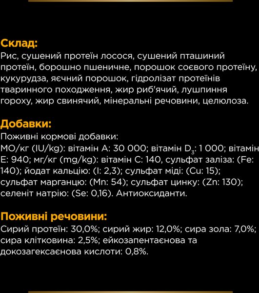 | Состав | Рис, сушеный протеин лосося, сушеный птичий протеин, мука пшеничная, порошок соевого протеина, кукуруза, яичный порошок, гидролизат протеинов животного происхождения, жир рыбий, шелуха гороха, жир свиной, минеральные вещества |