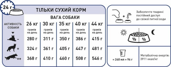 Полнорационный сбалансированный сухой корм для взрослых собак крупных размеров (вес собаки от 26 до 44 кг) в возрасте от 15 месяцев и старше.