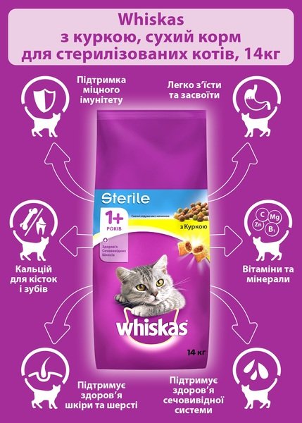 - Сухой корм для стерилизованных кошек Whiskas с курицей 14кг