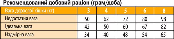 Рекомендуемую ежедневную порцию корма можно разделить на два приема. Индивидуальные потребности в питании могут отличаться в зависимости от размера, возраста и уровня активности животного. Данные предписания носят исключительно рекомендательный характер. Для достижения оптимального состояния животного может потребоваться смена рациона. Переход на новый вид корма должен происходить в течение недели. Свежая чистая вода должна постоянно быть доступной вашему питомцу. Хранить в сухом и прохладном месте.