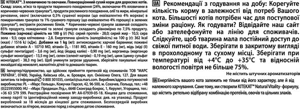 Kitekat предлагает 100% полноценное и сбалансированное питание для вашей кошки. Натуральная формула для повышения жизненного тонуса обеспечивает вашу кошку всеми необходимыми питательными веществами и витаминами, необходимыми для ее приключений.