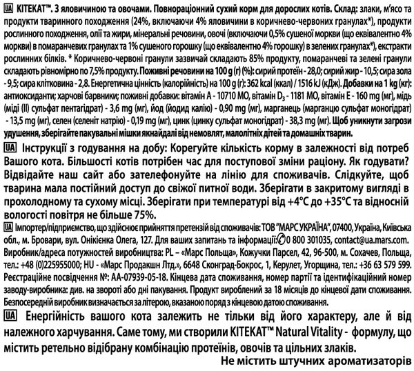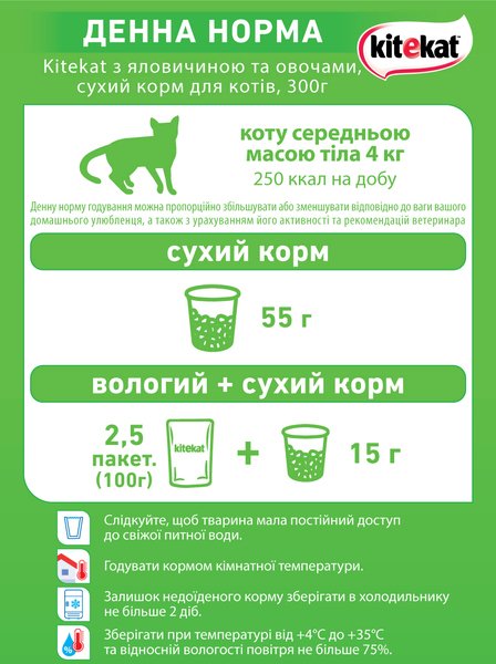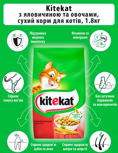 Kitekat предлагает 100% полноценное и сбалансированное питание для вашей кошки. Натуральная формула для повышения жизненного тонуса обеспечивает вашу кошку всеми необходимыми питательными веществами и витаминами, необходимыми для ее приключений.