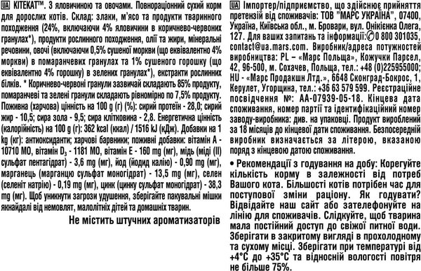 - Сухой корм для взрослых кошек KiteKat с говядиной и овощами 300г