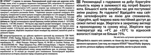 Kitekat предлагает 100% полноценное и сбалансированное питание для вашей кошки. Натуральная формула для повышения жизненного тонуса обеспечивает вашу кошку всеми необходимыми питательными веществами и витаминами, необходимыми для ее приключений.