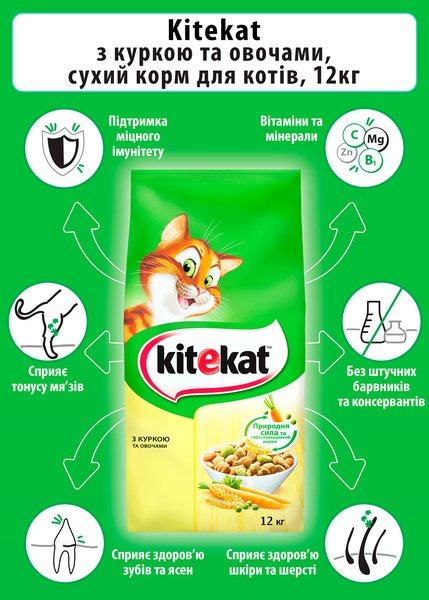 - Сухой корм для взрослых кошек KiteKat с курицей и овощами 12кг