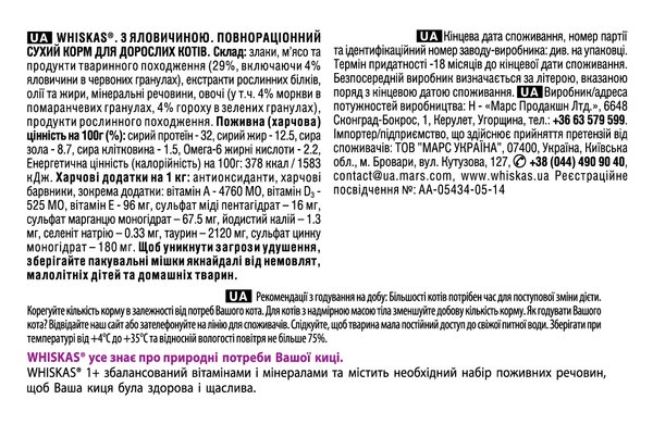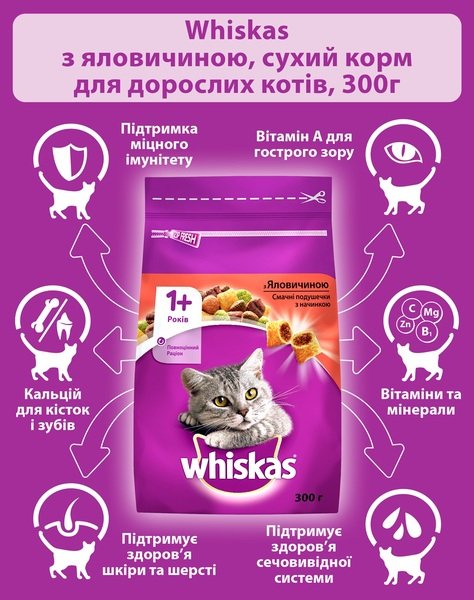 - Сухой корм для взрослых кошек Whiskas з яловичиною 300г