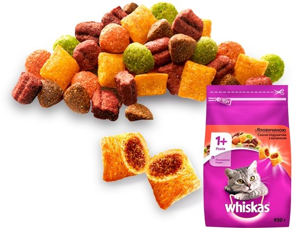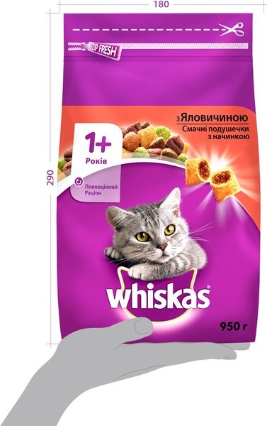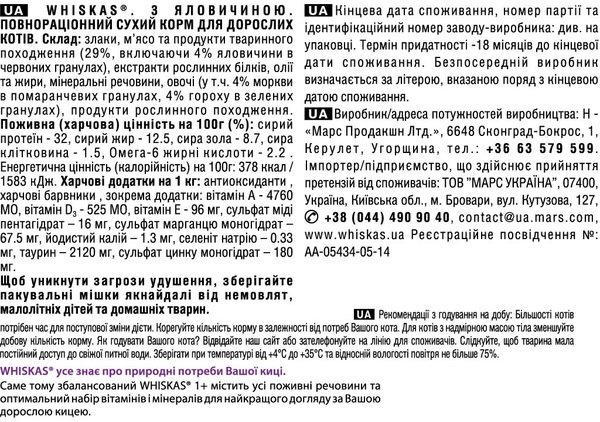- Сухой корм для взрослых кошек Whiskasas с говядиной