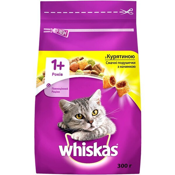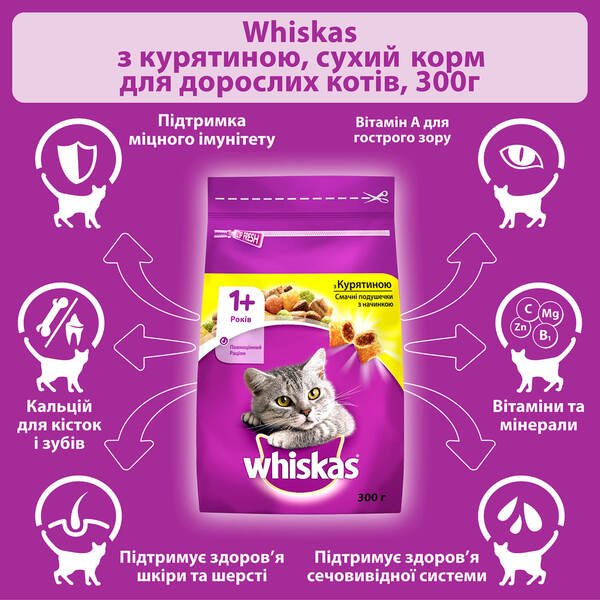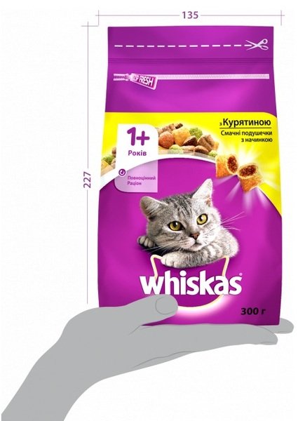 - Сухой корм для взрослых кошек Whiskasas с курицей 300г