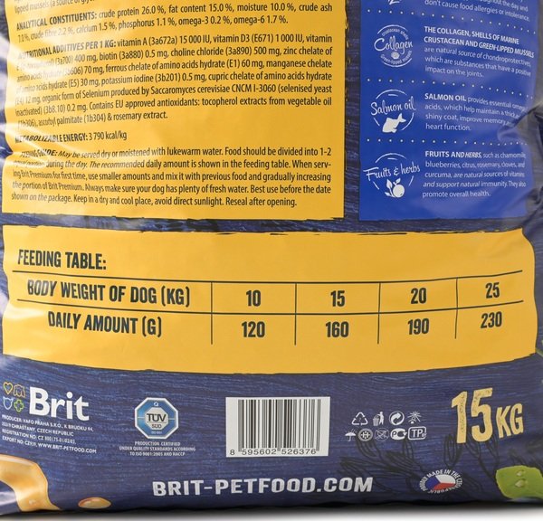 | Состав | Курятина 45% (дегидратированная 25%, очищенная от костей 20%), овес, пшеница, куриный жир (консервированный смесью токоферолов), кукуруза, сушеные яблоки, лососевое масло (2%), гидролизованная куриная печень, пивные дрожжи, коллаген, панцири ракообразных (источник глюкозамина, 210 мг/кг), экстракт (источник хондроитина, 150 мг/кг), Травы и фрукты (гвоздика, цитрусовые, розмарин, куркума, 120 мг/кг), мананолигосахариды (120 мг/кг), фруктоолигосахариды (90 мг/кг), юкка Шидигера (90 мг/кг), сушеная ромашка (80 мг/кг), новозеландские зеленые мидии (источник гликозаминогликанов, 50 мг/кг), сушеная голубика (50 мг/кг) |