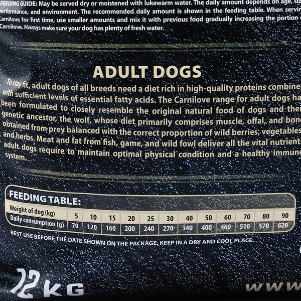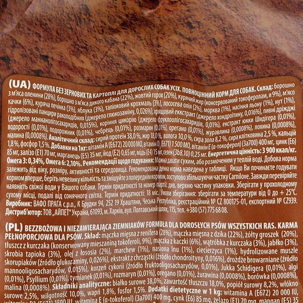 | Состав | Мука из мяса северного оленя (28%), мука из мяса дикого кабана (22%), желтый горох (20%), куриный жир (консервирован токоферолами, 9%), мука из утки (6%), куриная печень (3%), яблоки (3%), крахмал из тапиоки (3%), рыбий жир лососевый (2%), морковь (1%), льняное семя (1%), нут (1%), гидролизованные панцири ракообразных (источник глюкозамина, 0,026%), Экстракт хряща (источник хондроитина, 0,016%), пивные дрожжи (источник маннан-олигосахаридов, 0,015%), корень цикория (источник фрукто-олигосахаридов, 0,01%), юкка Шидигера (0,01%), водоросли (0,01%), псиллиум (0,01%), тимьян (0,01%), розмарин (0,01%), орегано (0,01%), клюква (0,0008%), голубика (0,0008%), малина (0,0008%) |
