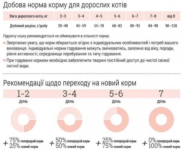 | Пищевые добавки | Витамин A 25000 МЕ, витамин D3 800 МЕ, витамин Е 600 мг, витамин C 460 мг, холина хлорид 2100 мг, биотин 1.8 мг, витамин В1 8 мг, витамин В2 10 мг, витамин В3 30 мг, витамин В5 40 мг, витамин В6 10 мг, В9 фолиевая кислота 0. 7 мг, витамин В12 0.18 мг, цинк 160 мг, железо 32 мг, марганец 50 мг, йодид калия 4 мг, медь 7 мг, селен 0.2 мг, магний 0.06 мг, L-метионин 4000 мг, таурин 2100 мг, L-карнитин 100 мг. Антиоксиданты природного происхождения: экстракты цитруса, черной смородины, винограда |