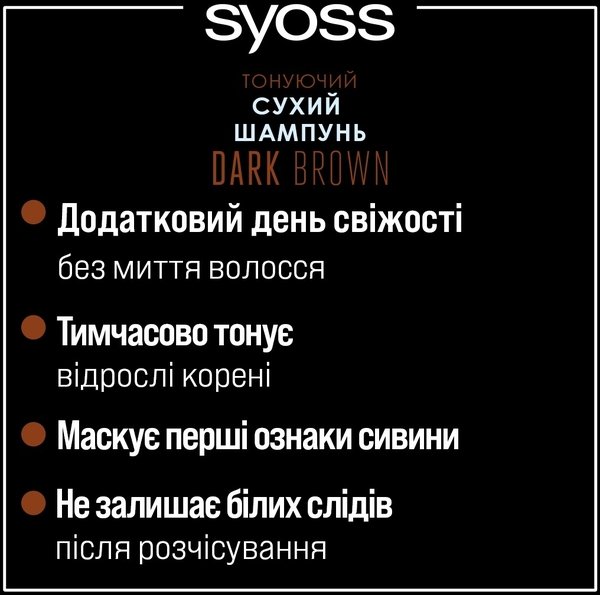 Тонирующий сухой шампунь Syoss Dark Brown временно тонирует отросшие корни и маскирует первые признаки седины, придавая дополнительный день свежести волосам.