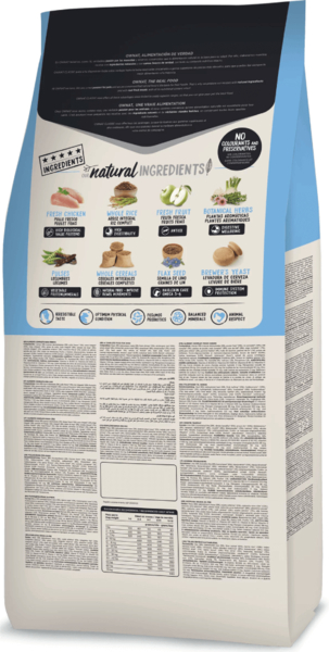 Состав Мясо - 39% (дегидратированное мясо - 29%, свежая курица - 10%), цельнозерновой рис - 12%, цельная пшеница - 9%, куриный жир, цельная кукуруза - 8%, пшеничные отруби - 8%, цельный ячмень - 7%, цельный горох - 2%, свежее яблоко - 1%, жир лосося, семена льна - 1%, мякоть свеклы, фрукто- и маннаноолигосахариды, пивные дрожжи - 0,5%, ботанические травы - 0,02% (фенхель обыкновенный, эхинацея, тимьян), экстракт юкки Шидигера