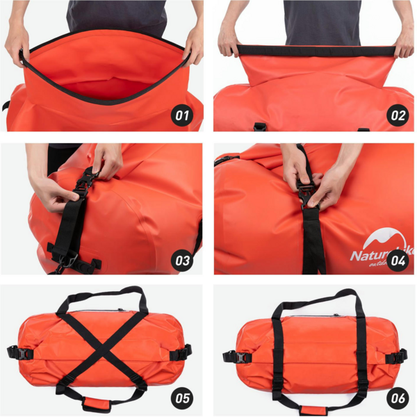 Сумка компактная, достаточно вместительная, позволяет хранить вещи в целостности, защищает от грязи и проникновения воды. Аксессуар соответствует стандарту IPX6, однако стоит учитывать, что сумка не должна подвергаться полному погружению под воду. Такой удобный баул Naturehike пригодится не только в походах, он станет отличным решением для рафтинга, скалолазания, а также для сплавов. За счет наличия специальных вставок на ручках удастся предотвращать натирания рук во время транспортировки. Кармашек внутри позволит хранить сухие вещи или документы. Баул можно носить не только как сумку, а и как рюкзак, для этого используются 2 лямки на плече. Застегивать сумку очень удобно с помощью змейки. Чтобы избавиться от лишнего воздуха внутри, достаточно выдавить его с помощью ремешков. Таким образом, аксессуар будет занимать минимум места.