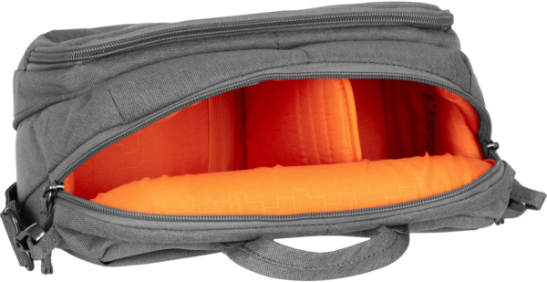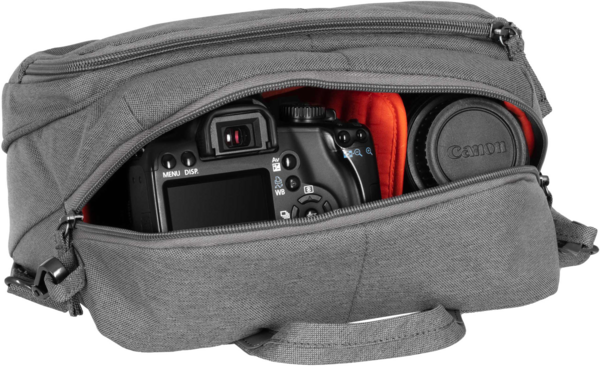 Она имеет мягкую внутреннюю часть со съемным разделителем, без которого эту "фото" сумку можно превратить в обычную повседневную сумку. Внутри сумки есть подвижная нижняя подкладка, которая улучшает посадку устройства и аксессуаров. Снаружи сумка имеет карман с быстрым доступом: один на клапане с вертикальной молнией и другой на обратной стороне.