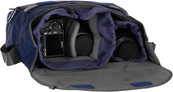 Мобильная нижняя подкладка улучшает посадку устройства и аксессуаров. Благодаря внешнему плоскому и расширяемому карману благодаря внешней резинке, внутри имеются специальные отсеки для хранения карт памяти и крышки объектива. Сумка имеет двойное закрытие, помимо застежки на липучке, есть также внешний защелкивающийся крючок-карабин, который можно застегнуть на маленьком металлическом отверстии, сделанном на бирке с логотипом.