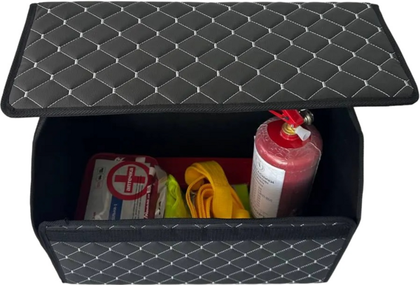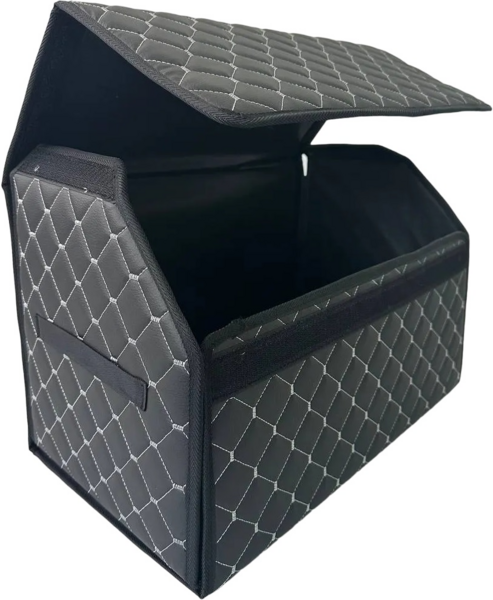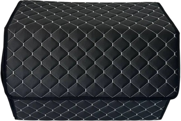 Сумка-органайзер (саквояж) - это практичный аксессуар для организации и хранения вещей в автомобиле. Она имеет один основной отдел с двумя перегородками, что позволяет удобно разделять и упорядочивать ваши вещи. Благодаря этому вы сможете держать все необходимое под рукой и избежать беспорядка в багажнике. Изготовлена из высококачественной черной экокожи, что придает ей стильный и современный вид. Серая нить, которой прошито изделие, добавляет эстетической привлекательности и обеспечивает дополнительную прочность швов. Экокожа отличается высокой износостойкостью, что гарантирует долговечность аксессуара. Для удобной переноски сумка оборудована двумя ручками по бокам, что позволяет легко извлекать ее из багажника и переносить с места на место. Кроме этого, на задней стенке сумки есть липучка, которая обеспечивает надежную фиксацию в багажнике. Это помогает предотвратить скольжение и перемещение сумки во время движения автомобиля, обеспечивая сохранность содержимого в целости и сохранности.