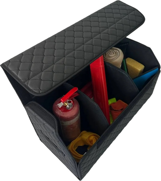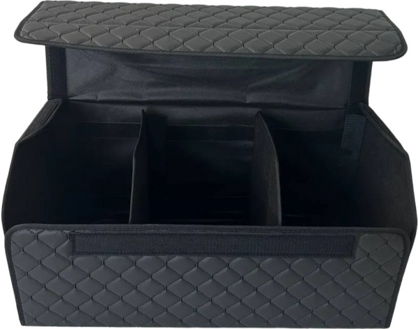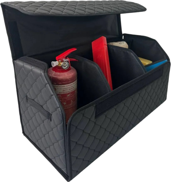 Сумка-органайзер (саквояж) - это практичный аксессуар для организации и хранения вещей в автомобиле. Она имеет один основной отдел с двумя перегородками, что позволяет удобно разделять и упорядочивать ваши вещи. Благодаря этому вы сможете держать все необходимое под рукой и избежать беспорядка в багажнике. Изготовлена из высококачественной черной экокожи, что придает ей стильный и современный вид. Серая нить, которой прошито изделие, добавляет эстетической привлекательности и обеспечивает дополнительную прочность швов. Экокожа отличается высокой износостойкостью, что гарантирует долговечность аксессуара. Для удобной переноски сумка оборудована двумя ручками по бокам, что позволяет легко извлекать ее из багажника и переносить с места на место. Кроме этого, на задней стенке сумки есть липучка, которая обеспечивает надежную фиксацию в багажнике. Это помогает предотвратить скольжение и перемещение сумки во время движения автомобиля, обеспечивая сохранность содержимого в целости и сохранности.