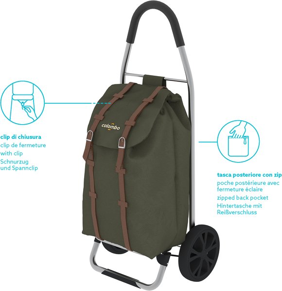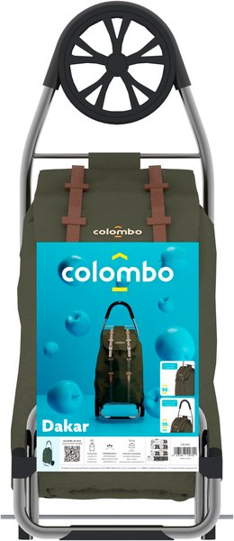 Сумка-тележка Colombo Dakar - изготовлена из высококачественных материалов и имеет стильный дизайн. Особенностью данной модели является усиленная рама, покрытая порошковой краской для защиты от коррозии, легкая и прочная, способная перевозить грузы до тридцати килограммов. Два больших колеса для легкого передвижения по неровностям и бордюрам. Зона для держания тележки прорезиненная для комфортного использования в холодное время года. Удобное хранение и перемещение сумки-тележки обеспечивается складным основанием и съемными колесами.