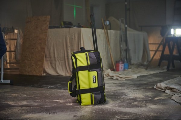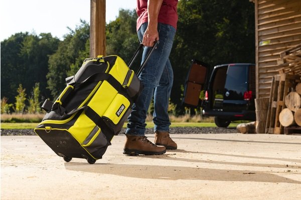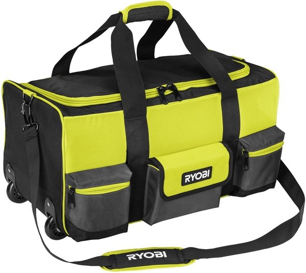 - Ryobi Сумка для инструмента с колесиками большая. Емкость 49л. Рассчитана на работу в тяжелых условиях независимо от того, работаете ли вы в пыльном помещении или после дождливого дня