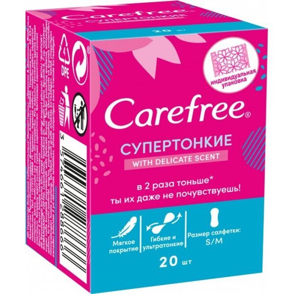 Ежедневные прокладки с мягкостью хлопка Carefree СуперТонкие with Cotton feel – наши самые тонкие ежедневки. Идеально подойдут для дней, когда у вас нет месячных, но вы хотите ощущать свежесть в течение всего дня. Ультратонкие и гибкие, они повторяют ваши движения и придают вам ежедневный секретный импульс дополнительного комфорта. Держите упаковку СуперТонких в своём ящике для белья и ещё одну - в своей сумочке.