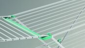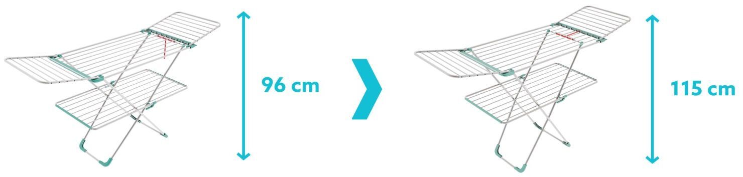 Благодаря двойной системе размещения рабочих поверхностей, общая длина стержней составляет тридцать метров. Сушилка регулируется по высоте, что позволяет при необходимости развешивать длинные вещи.