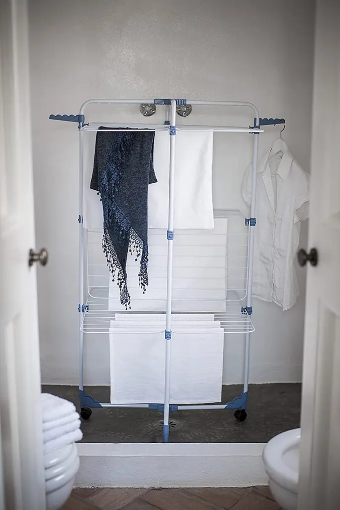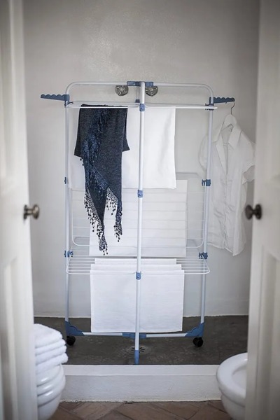 - Три уровня сушилки легко вмещают до тридцати метров белья.