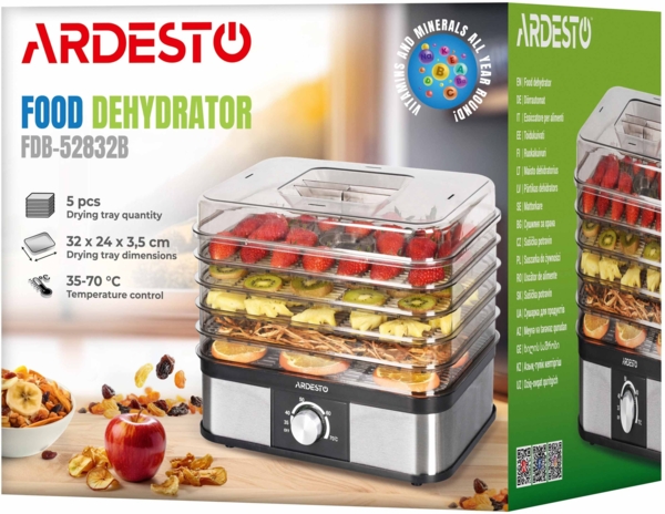 Сушилка для продуктов Ardesto - это надежное и функциональное устройство мощностью 245 Вт. Оснащена 5 просторными поддонами размером 32х24х3,5 см, обуславливая возможность одновременной сушки различных продуктов. С температурным диапазоном от 35°C до 70°C обеспечена гибкость настроек, а с механическим управлением упрощено использование.