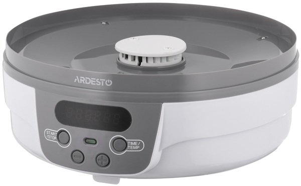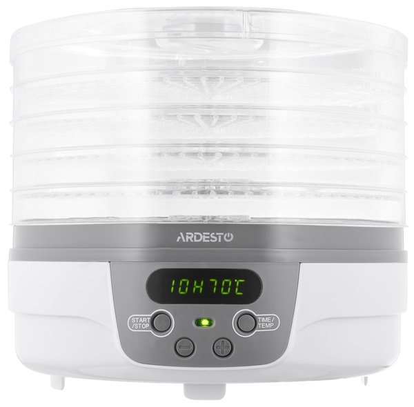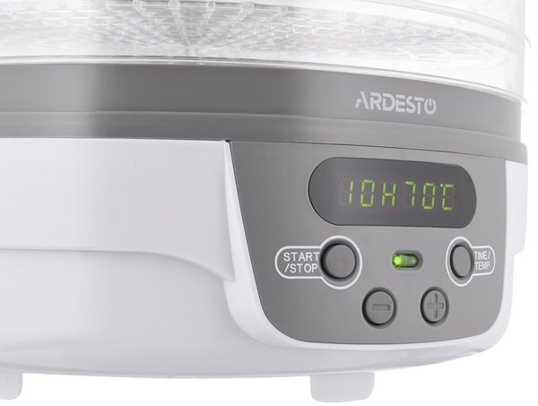 ARDESTO FDB-5321T белого цвета с серым основанием. Ее крышка с отверстиями для воздуха и пять поддонов диаметром 32 см и высотой 3 см – прозрачные, что удобно для слежения за процессом сушки. Температура сушки регулируется от 40 до 70 °С. Управление – электронное, мощность составляет 250 Вт. На всех уровнях продукты равномерно высушиваются с сохранением всех минералов и витаминов. Наличие таймера от 1 до 48 ч упрощает процесс и экономит время