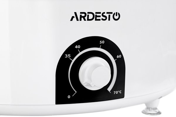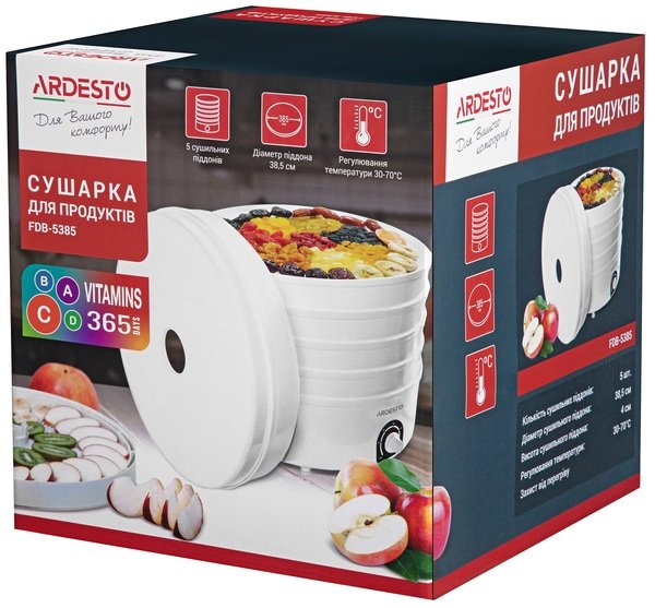 Ardesto FDB-5385 подходит для сушки: фруктов, овощей, зелени, ягод, мяса, рыбы, хлеба и других продуктов. За счет температуры сушки в пределах от 35°С до 70°С, продукты сохраняют значительное количество витаминов и минералов. Информацию о температуре и времени приготовления можно посмотреть в инструкции.