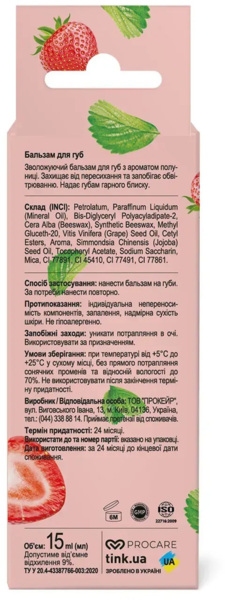 Увлажняющий светло-розовый бальзам для губ с ароматом клубники.