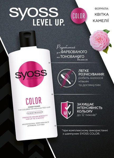 Бальзам SYOSS Color с цветком камелии для окрашенных и тонированных волос фиксирует цветные пигменты и защищает волосы от потускнения до 12 недель.