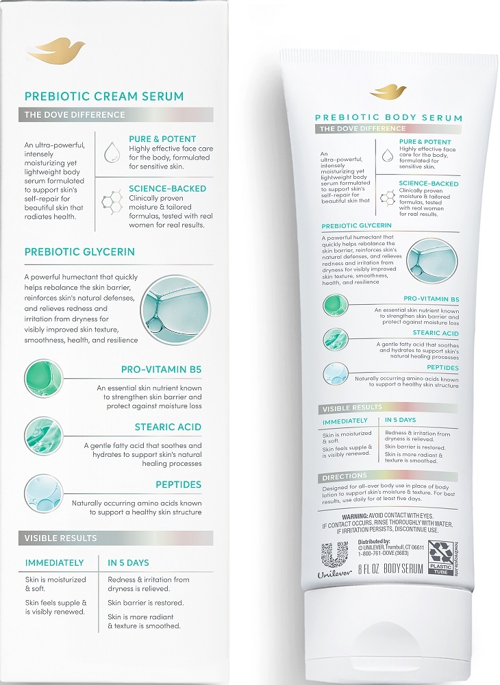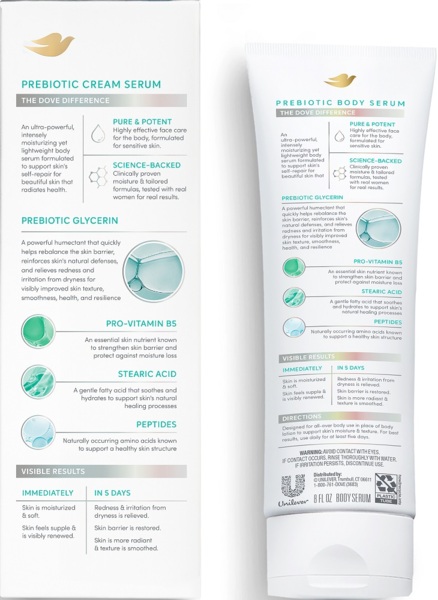 Успокаивающая сыворотка для тела Dove Body Serum Prebiotic + Sensitive — для сухой и чувствительной кожи. Подходит для тела и лица. Ультраэффективная, интенсивно увлажняющая, но при этом лёгкая сыворотка, разработанная для поддержки естественного восстановления кожи.