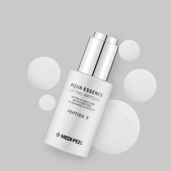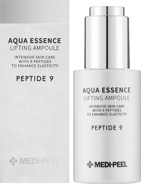 Антиоксидантная лифтинг-сыворотка с пептидами Medi-Peel Peptide 9 Aqua Essence Lifting Ampoule обладает большим спектром функций: улучшает цвет лица, мягко осветлят нежелательную пигментацию и выравнивает тон, повышает упругость, укрепляет тургор, разглаживает кожные заломы и уменьшает выраженность морщин. Блокирует разрушающее действие свободных радикалов, уплотняя кожу и значительно повышая её барьерные функции. Оказывает успокаивающее действие, борется с тусклостью, тонизирует и возвращает здоровое сияние. Интенсивно увлажняет, напитывает витаминами и устраняет шелушения.
